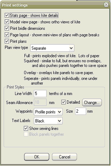 Решил написать статью с подробным, насколько смогу, описанием процесса шитья кайта параски. Эта статья не претендует на абсолютность, но все же те приемы о которых я буду говорить- правильные, и выполняя их, мы получим максимально качественно пошитый кайт. Начнем с проекта... и так мы выбрали или спроектировали кайт и теперь наша задача подготовить выкройки нашего крыла. Открываем сюрфплан. Идем в пункт меню «файл», выбираем пункт Print, выбираем наш принтер, ставим формат бумаги (А4 обычно), ориентация книжная, ОК. Идем в меню File -> print preview . В появившемся окне нам предлогают задать настройки того что выводить на печать и как это будет выглядеть. Первая галка Stats page это общая информация о кайте (площадь, удлинение, хорда....), то что показано на форме Kite Sizing. Пункт Model view нам уже знаком. Bridle Dimensions расстроповка купола. Page layout- общая компоновка выкроек. Print plan- сами выкройки разбитые по листам. Ставим на этих пунктах галочки. У пункта Print plan есть поле выбора. выбираем Separate. Остальные значения обязательно ставим как на картинке.