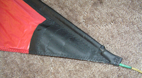 Для этого берем стропу или ленту дакрона (главный кретерий выбора материала- отсутствие растяжения) и пускаем ее по ТЕ. Прошиваем зигзагом подгибая припуск на шов на кайте. Концы этой ленты должны выходить петлями. К ним будут цепляться клеванты. Вот так сделано у меня.