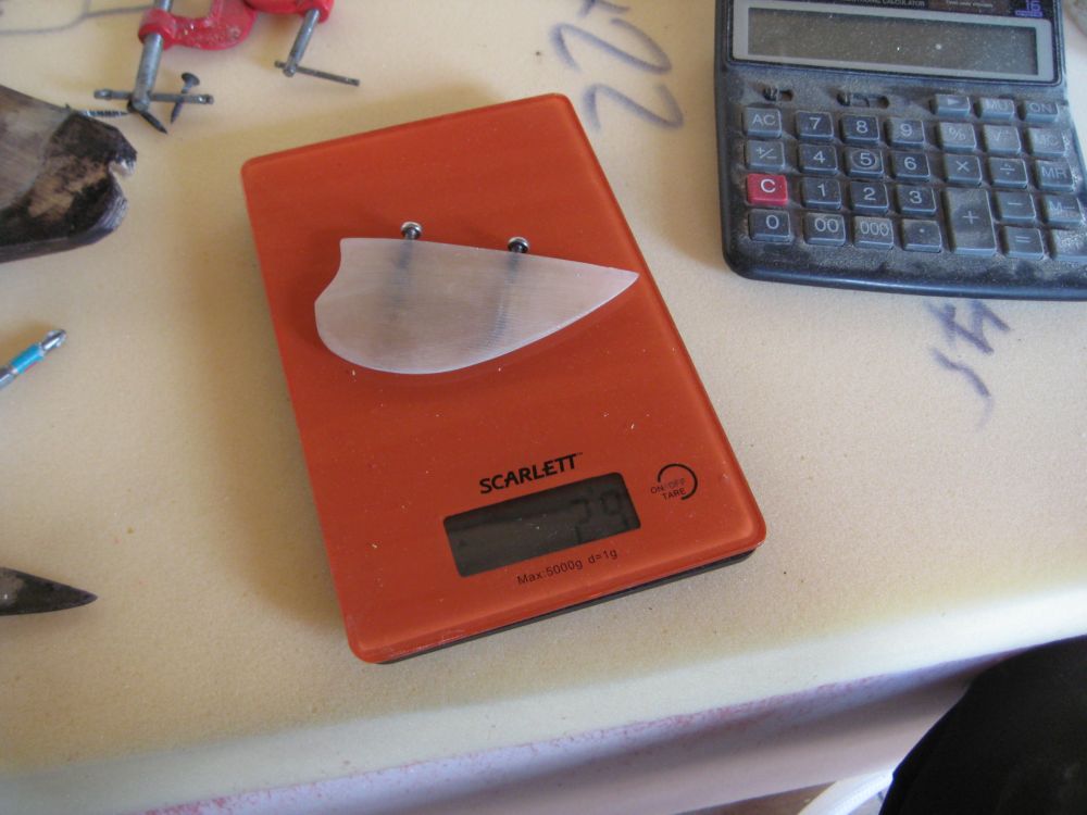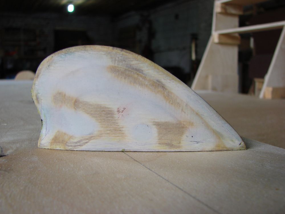 Я изготовил плавник из фанеры и авто шпаклёвки , симитричность плавника можно проконтролировать по слоям шпона.