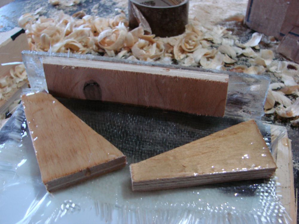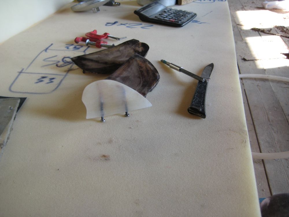 Я изготовил плавник из фанеры и авто шпаклёвки , симитричность плавника можно проконтролировать по слоям шпона.