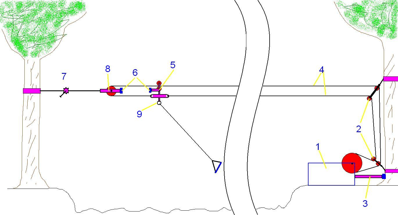 Думаю, для экономии веса, стоимости и размеров, нужно расчитывать лебедку под крепление за деревья, особенно дальний ролик, да и ведущий тоже, ведь реверсивная в отличии от нереверсивной должна быть натянута хорошо и высоко думаю 3 метра минимум с учетом провисания.