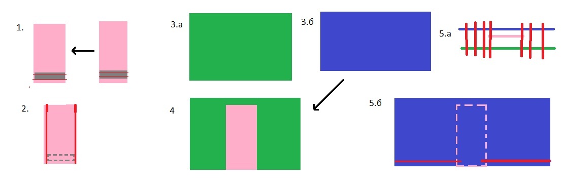 1. Изготовить два одинаковых прямоугольничка (Розовый- клапан) длинной 20-25 сантиметров, и шириной в среднюю секцию. К передним краям пришить (Красный - шов) Липучки (Серый - липучки)