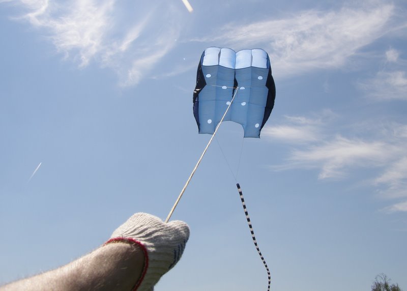 Аппарат получился не лёгкий. Поэтому минимальный ветер для него 3...4 м\с. Но зато благодаря усилениям, кайт можно будит запускать в ветер до 20 м\с. Главное, чтобы верёвка выдержала.