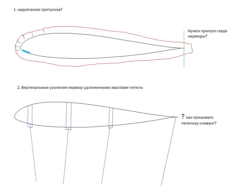1. надо ли надсекать припуск на скате лобика на нервюре или на полотнище, чтобы загибалось при пришиве точнее, а также нужно ли делать припуск на задней кромке нервюр или делать их по нулям? Если делать то я не понял как это зашивается в кромке.