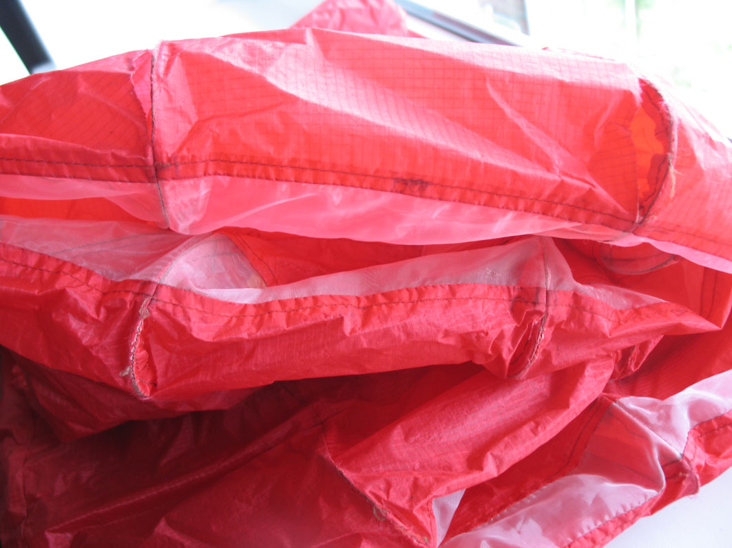 А точнее вскрывается задняя кромка данной секции или 2 соседствующие нервюре ячейки. Далее выворачивается на изнанку, путем протаскивания потертой передней части кайта через отверстие распоротой задней кромки...