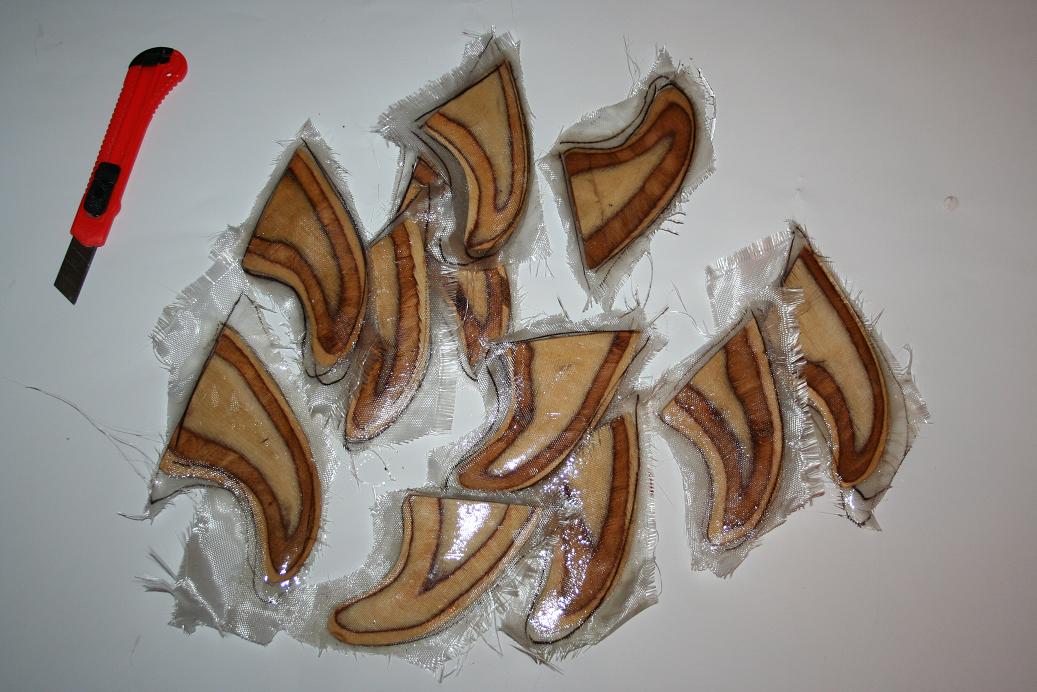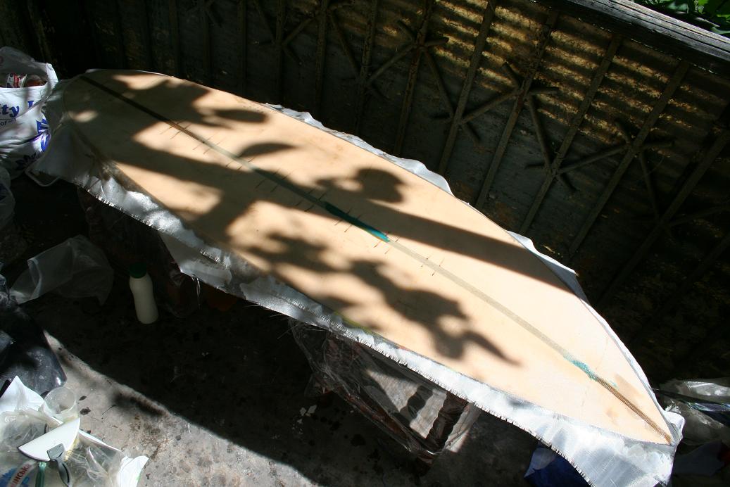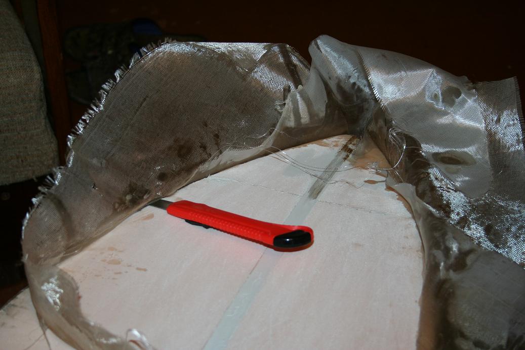 Далее по три слоя стеклоткани SSK 100 (100гр\м2), предварительно отжигал от парафина. Склеивал в стык, и когда смолу прихватило, канцелярским ножом обрезал излишки.