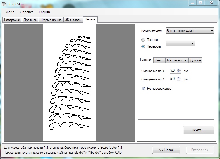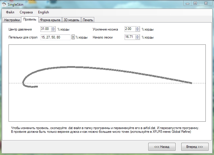 А самое главное, встроил в прогу возможность печатать на А4 для последующей слейки. Так что теперь это в своем роде аналог Surfplan, только для однослойников ). И возможность проще менять профиль, просто киньте в папку с программой файл airfoil.dat из XFLR5, прога его автоматически загрузит при старте.