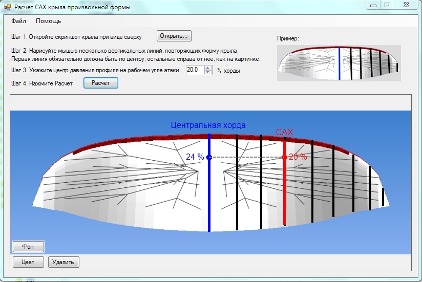 После этого откройте этот скриншот в прилагаемой программе CAX.exe. Сначала нарисуйте мышью поверх крыла центральную линию, а потом справа от нее еще несколько вертикальных, повторяя форму крыла. Ориентируйте на картинку примера в самой программе. И нажмите Расчет. Если цвет линий плохо виден на фоне картинки, всегда можно нажать кнопку Цвет, которая инвертирует яркость линий или кнопку Фон, которая включает/выключает картинку.