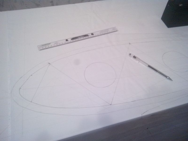 4. Режем эту Таффету заточенным паяльником по красным (наружным) линиям сразу попарно кроме центральной нервюры, шьем швами из гайда, чтобы самый "внутренний" шов проходил по черным линиям выкройки, начиная с нижнего слоя+ нервюры, а потом дошиваем верхний и сразу же пришиваем петельки.