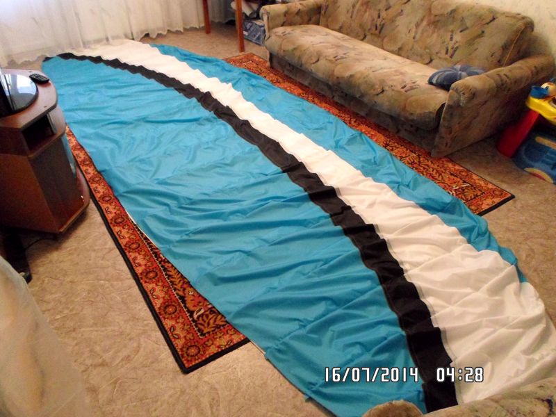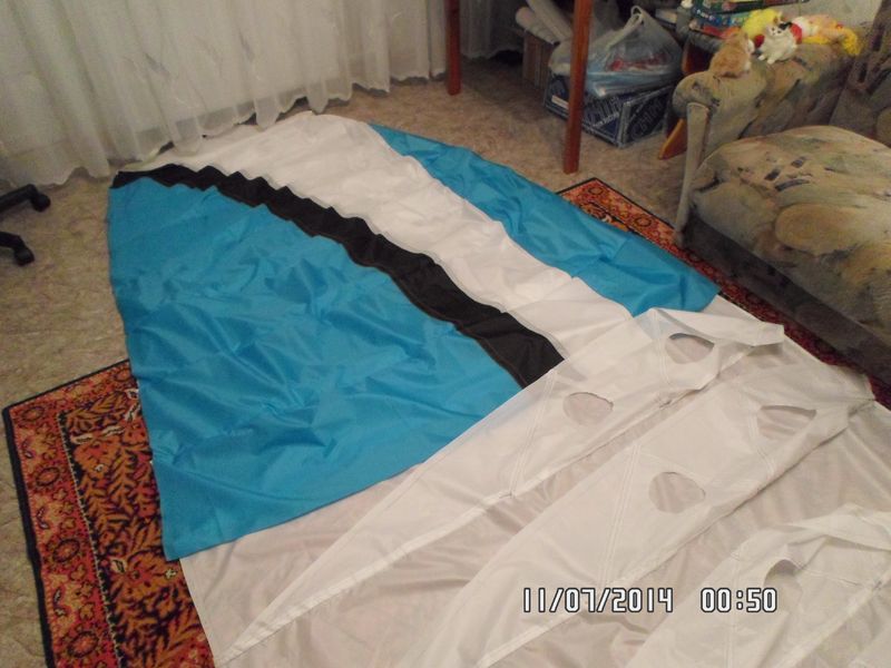 рисунок я приглядел с какого то спидика. в инете на фотки наткнулся и уж больно он мне по душе стал. заднюю кромку прошил вчера. сегодня сколько успею поделаю стропы. может в выходные на огороде попробую поднять бомбардировщик этот.
