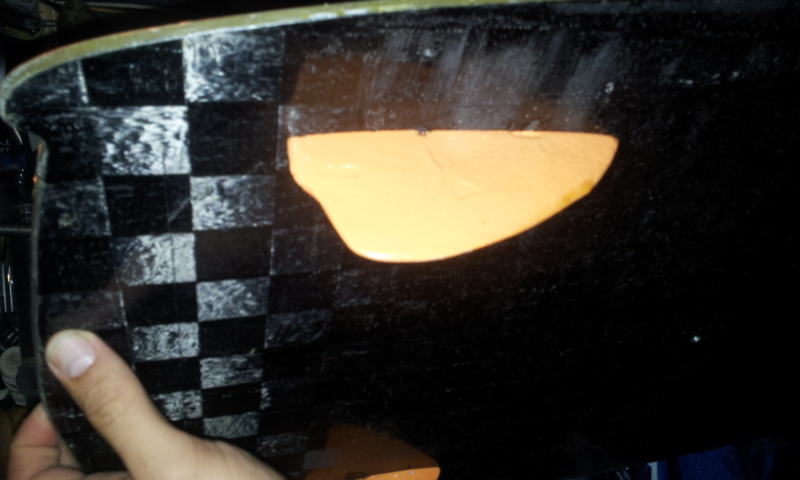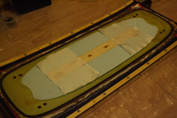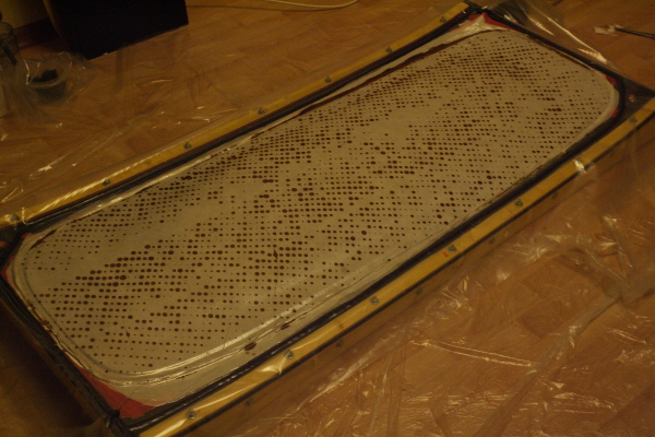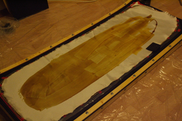7. вырезал ткани и собрал пирог. для получения глянца на нижней поверхности все монтировал на пвх пластине для облицовки стен (длина 3 м, разрезал пополам и соединил боковыми гранями), каждый слой пропитывал смолой на месте. после укладки нижних 4 слоев уложил сердечник и на него верхние слои. наносил смолу валиком: