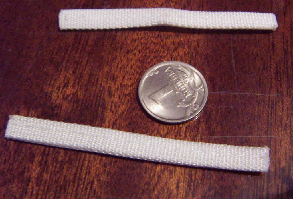Лента для крепления строп. Я нашел ее на оптовке среди разного хозяйственного барахла. 2 руб/метр, грубая прочная лента из какого-то синтетического материала (капрон? полиамид?) шириной 1 см. В магазинах тканей либо дороже, либо хлипкие. Складываем ее пополам и прошиваем. На первых кайтах не складывал и петли были заметно крупнее.