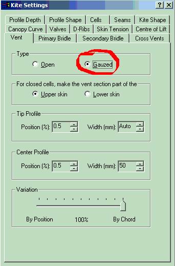 Открывается окно "Canopy Curve", ставим крыжик в трех правых квадратиках - закрыть три секции на конце крыла. Остальные ставим через один. На 8ми метровом змее у меня получилось, что открыты две соседние центральные секции, на этом рисунке (для Гаммы 2м) получится 4 (две слевой половины крыла, две с правой). Альтернатива - поставить еще один крыжик и сделать в центре две соседние закрытые секции.