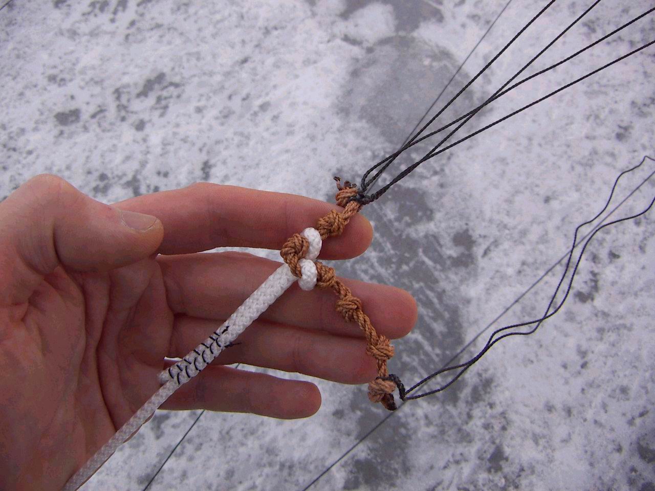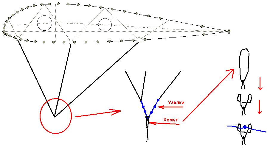 Здесь отмечу как делается регулируемый угол атаки (подсмотрено на кайтах Дюны). Перемещая хомут по узелкам можно за минуту изменить угол атаки. Именно это место испытывает максимальные нагрузки и полиамидная нить быстро перетерирается. Поэтому здесь используем более прочные материалы. Все остальные места соединения строп пропитываем клеем, оставшиеся у узелков хвостики нити обрезаем (когда высохнет клей), или прячем в термоусадочные трубки.