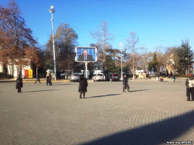 Крымчане проигнорировали "уличную" пресс-конференцию президента России Владимира Путина, которую 17 декабря в Крыму транслировали с помощью мобильных телевизионных устройств. Об этом сообщает Радио Свобода.
