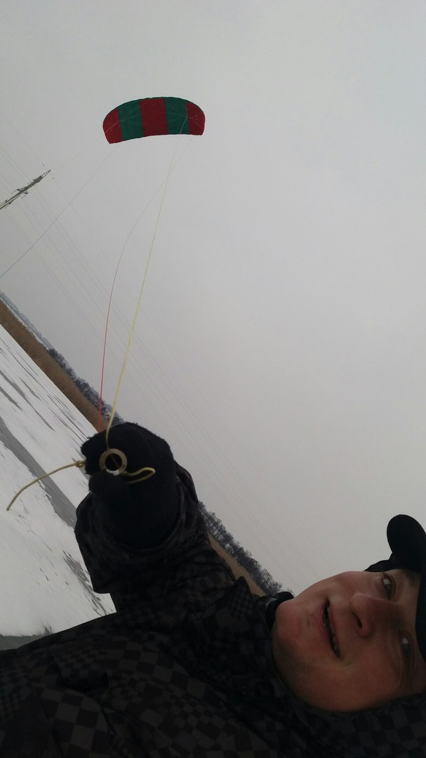 и в этот же день, привязав бытовую веревку вместо строп опробовал его. Полетел!!! ветер был сильный управление не привязывал. Перелетал через горлову, веселились мы не долго, порвалась веревка. Он тянул меня по снегу в ботинках! Радости нет предела...