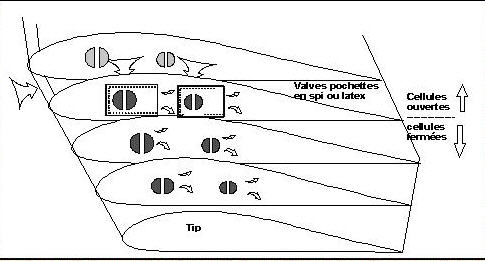 На первой фотке показан клапан в задней кромке кайта(TE, trailing edge) я бы поставил парочку где надо думать.