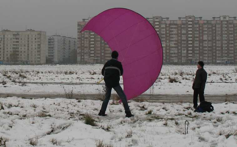 На территории г. Харькова лицом к лицу сошлись двоюродные братья по ветряным делам каркасные кайты Магик и Пассат. Встреча происходила с целью познакомиться и познакомить Вас с основными параметрами выше означенных произведений постсоветского пространства, т.е. так называемые кайт-тесты. Сразу же скажу, что провести их по полной программе не удалось из за как обычно не соответствующей идеалам погоды. В этот день было пасмурно, температура около 5 градусов тепла, под ногами интенсивно таял первый снег, создавая неудобства как для ног, так и увлажняя и утяжеляя ткань кайтов. Но ввиду того, что в кайт тесте участвовал гость из Москвы, а сама поездка планировалась заранее, то „матч состоялся при любой погоде“. Главный показатель – ветер, представлял из себя рванину со скоростью от 2 до 7 м/с с заходами до 15 градусов в ту и другую сторону от северо-западного направления.