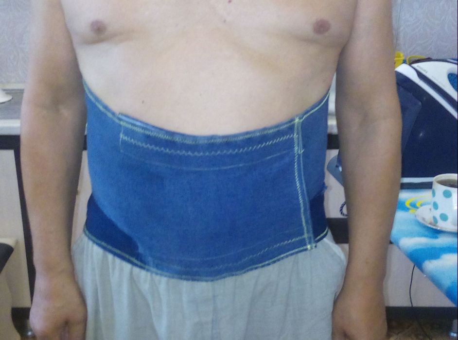 Решил сшить. Нашлись старые джинсы от внука, из очень хорошего материала, еще старого качества. Распорол и стал, что называется, ваять. Чертежи и выкройки не делал, все экспромт. Под поясницу, решил приладить надувную подушечку от надувного матраца, чтоб не собирались фалды и все лежало ровно. Из двух штанин и вставки получился пояс. С внутренней стороны пришил мягенький бархатистый отрез, приятный к телу. Получился карман, куда и укладывается подушечка. На передние клапана пришил ленту-липучку. Результаты на фото.