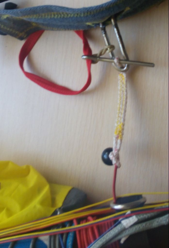 В общем разогнул крюк, за 7 минут сшил короткую стропку, согнул кольцо на шпильке и привязал резинку чтоб не выскакивала и аварийную петлю. Все!