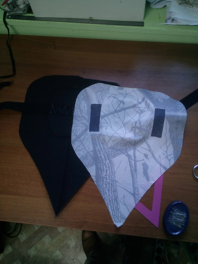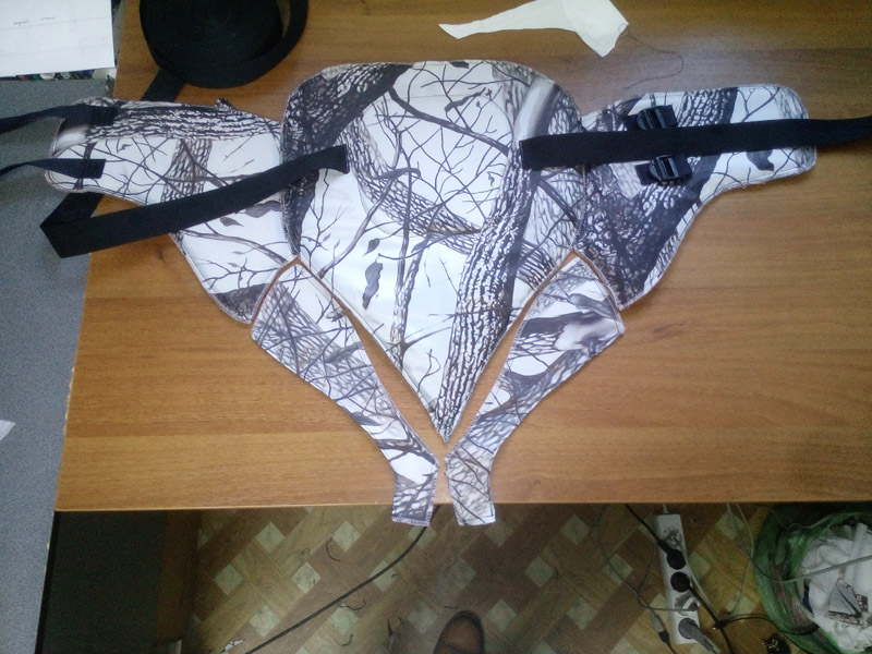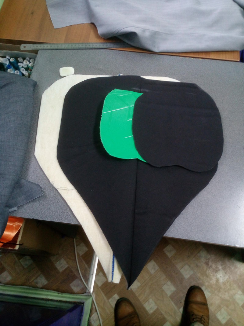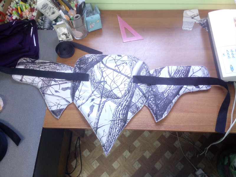 деталь плоская, выточки не делал. Но когда одеваешь вроде ничего сидит. Лента та же самая что и на крюк, 34мм, приглядывал сначала какую-нибудь 10мм тесьму и так и сяк вертел, потом забил и купил 3 метра широкой. Шьется легко, а главное и выглядит неплохо.