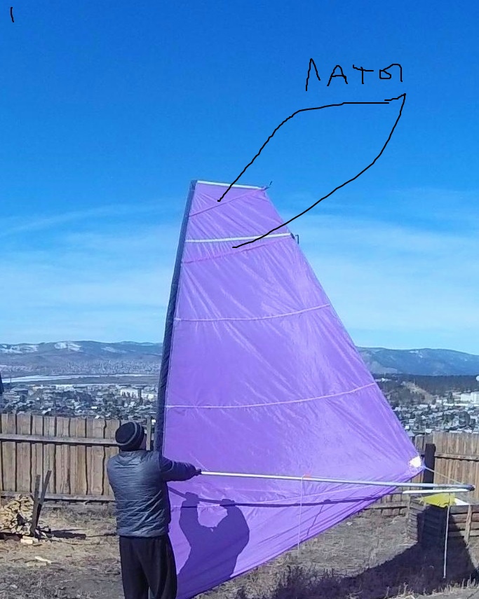 Ты же продолжаешь самодельничать не советуясь, потому косяки. Латы могут быть на 30-40 см длиной. Могут быть через все крыло, а могут быть камберные т.е. с упором в мачту. Последние самые крутые, но для таоего паруса вполне прокатил бы и первый вариант. Латы делают из стеклопластика миллиметра полтора два толщиной, ширина миллимеиров 25-30. Латкарман просто нашивается сверху на парус перпендикулярно задней кромке, а не мачте.можешь порезать готовые латы пополам и добавить из них еще 2 на парус. Нужна еще пара лат по швам выше гика и одна посредине нижней кромки перпендикулярно к ней ниже гика. Парус, кстати выглядит вполне неплохо. Какая толщина профиля у него?