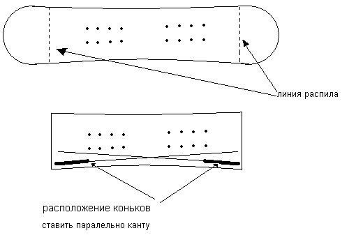 В прошлом году у нас в Находке совсем не было снега .Чтобы особо не заморачиваться с основой для Iceboardа, я взял старый сноуборд, с отслоившимся скользяком и повылетавшими кантами,два лезвия от старых канадок ,и немного креатива. Окончательно оторвав скользяк и отпилив расслаивающиеся концы , привинтил вместо канта два лезвия от коньков через два слоя 8мм-ой фанеры . тк подпятник на лезвиях немного выше. Вместо бордерских креплений прикрутил лямки от виндсерфинга прямо на штатные отверстия.. О весе и жесткости позаботились производители исходной доски. В результате получился отличный Iceboard. На худой конец за основу можно использовать 10мм фанеру. Ниже привожу схемы изготовления