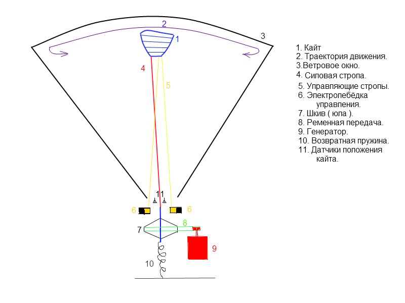По расчетам располагать электрогенератор на летающем агрегате не целесообразно, т.к. вес самого генератора и электрических проводов очень большой. Кевларовые тросы выдерживают гораздо большее механическое напряжение на разрыв, чем медные провода той же массы могут выдержать электрическое напряжение. Поэтому целесообразней использовать тягу змея. Так как необходимо запустить змей на максимально большую высоту, то выбор оптимальной по весу схемы на первом этапе очень важен.