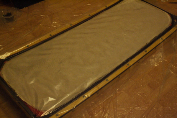 7. вырезал ткани и собрал пирог. для получения глянца на нижней поверхности все монтировал на пвх пластине для облицовки стен (длина 3 м, разрезал пополам и соединил боковыми гранями), каждый слой пропитывал смолой на месте. после укладки нижних 4 слоев уложил сердечник и на него верхние слои. наносил смолу валиком: