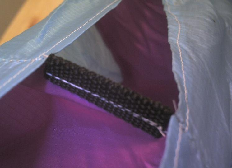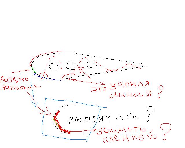 Т.е. берём ленту 2.5 см желательно жёсткую (в швейных магазинах почему-то называется "стропа"). Отрезаен по ширине заборника, складыаем пополам (повдоль) и нашиваем на нервюру. Это и эстетично, и просто, и работает.