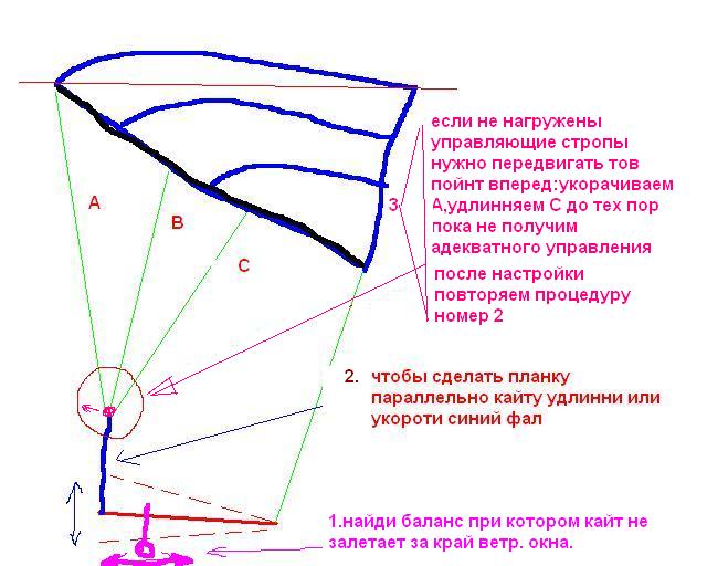 Если ты купол делал в Сёрфе, то на кой ля ты решил стропы делать по образу чужого кайта- программа стропы считает очень точно, а как ты это сможешь сделать на глаз, да ещё и не нарушить симметричность? Для того, чтобы сместить тов поинт даже на несколько процентов, нужно вообще все стропы изменить- какие удлинить, какие укоротить, бывает что какие-то остаются прежней длины. Да и разница в длинах бывает от нескольких миллиметров до десятков сантиметров, так что в полевых условиях на глаз нормально не перестроишь (не угадаешь). Советую делать так: рассчитай стропы сначала для одного значения (например 40%), отмерь их и сделай отметки на стропах в регулировочных местах. Это будет считаться началом отсчёта. Затем посчитай программой длины для другого значения тов поинт (напр 35%) и вычисли разницу между ними и начальными длинами, только не перепутай. Составь такую таблицу для нескольких знечений и иди испытывать. Решил сместить тов поинт- линеечкой отмерил разницу онтосительно первоначального значения и всё, продолжай полёты.