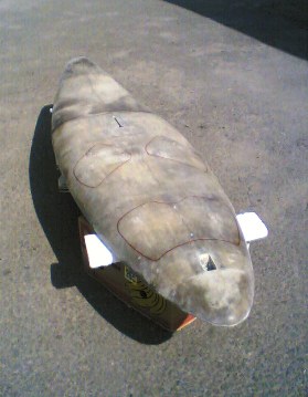 ...а стрингер позже.Пенопласт довольно малой плотности,поэтому хочу вначале обработать поверхность доски,потом оклеить ее бязью,а потом (когда поверхность станет защищенной) уже можно будет разрезать вдоль,и формовать стрингер,сразу вклеивая мачтовый степс и плавниковый колодец .