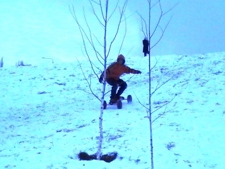 Нашли неплохое место,уклоны на любой вкус,достаточно ровно и раскатано(люди всякими фанерками ,санками раскатали,даже сноубордистов человек 6 было. Повылазили с нетерпенья на редкий снежек).Плюс, в темное время есть освещение.МБ показал себя очень неплохо по такой поверхности.Скорости очень большие,только поворачивать сложно,колеса в занос идут.Также из недостатков ,было то,что на большой скорости возникал в подвеске колебательный процесс.Хорошо хоть на неровностях амплитуда невырастала,сбивалось.Придется резиновые элементы подобрать пожесче.да и деку думаю новую сделать с увеличенной базой и более низким центром тяжести. Rolling Eyes