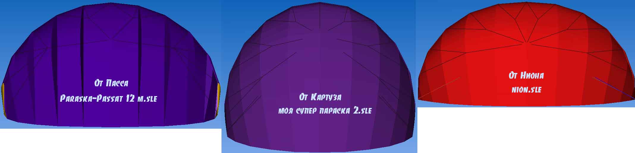 Добавление рибов-плоскостей при стандартной арочности мало что дает, у параски и так уши-шайбы огромны, до 25% площади в них. Расстроповка по плоскости дает искажения формы купола, что хорошо видно по ТЕ. Отсюда вывод - не стоит нагружать стандартную параску элементами, которые в основном меняют купол в нерасчетную сторону без особого выигрыша по качеству кайта.