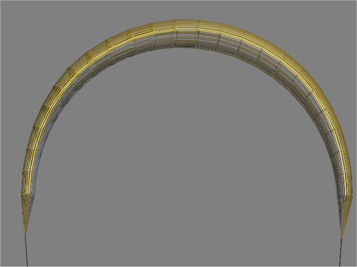 ... вообщем купол состоит из секций,каждая из которых имеет профиль.У этого профиля есть центр давления,который взависимости от самого профиля,угла атаки.... может менять свое положение.также у каждой секции есть условная точка приложения силовых строп,то что уравновешивает тягу.Теперь если все секции собрать "в кучу",то получаем вымышленную линию "давления купола" и линию "приложения строп".Теперь на нашем арочном фойле,где силовые стропы прикреплены к ушам располагается лента,прямая,распределяющая нагрузку на купол.Все остальное "в свободном полете" ,просто висит уравновешенное кучей сил.Вот чтоб кай нормально летал,нужно постараться эту кучу сил расположить правильно.Наша цель в конечном итоге какая? Кайт должен висеть в зените при ослабленных задних стропах с минимально возможной тягой вверх и обладать устойчивоситью формы,ничего не подворачивать. Если на обычных фойлах довольно большие возможности нам дает купольная строповка(правильно привязав веревки можно и пододеяльник запустить),то здесь ее нет. И все задается с помощью геометрии купола.