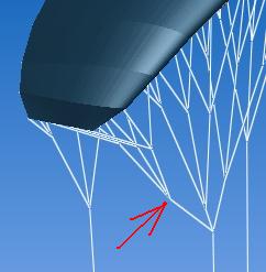 5. на нижних полотнищах и нервюрах отметить треугольниками точки крепления строп. на верхних можно поставить по три-четыре реперных точки (больше нет смысла, surflan выдает их слишком много, но я их вообще не рисовал и нет проблем, так как достаточно синхронизации по передней и задней кромке). на нервюрах обозначить прямоугольниками воздухозаборники (где есть), также можно обозначить уголками у верхнего края цепную линию, если ее усиливаете.