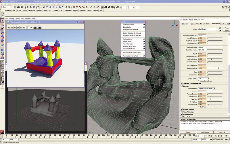 Кстати, Autodesk Maya умеет моделировать надувные объекты. Может кому-нибудь пригодится. Любой полигональный объект можно преобразовать в nCloth, задать тип материала (есть несколько готовых настроек - прорезиненная ткань, шелк и т.д.) и внутреннее давление. Потом нажать кнопку Play и смотреть что с ним будет. Таким образом можно надуть и сдуть объект. Работает довольно реалистично.