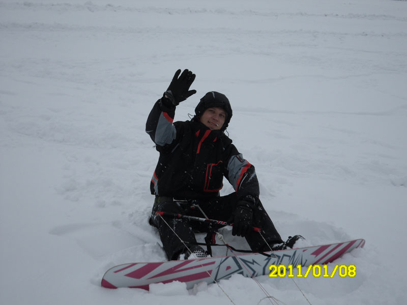 8 января опять пытался покайтить на сноуборде, ветра было мало, даже 10-ка клапанник еле взлетал, на порывах можно было немного проехаться, в общем отрабатывал приём отрыва 5-й точки от снега и старт и через несколько секунд возвращение на исходную...