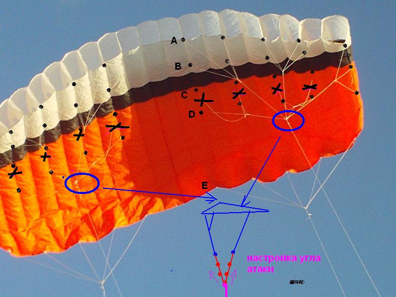 переставляя стропу удлиннитель по узелкам симетрично на обоих сторонах крыла можно легко настраивать угол атаки.