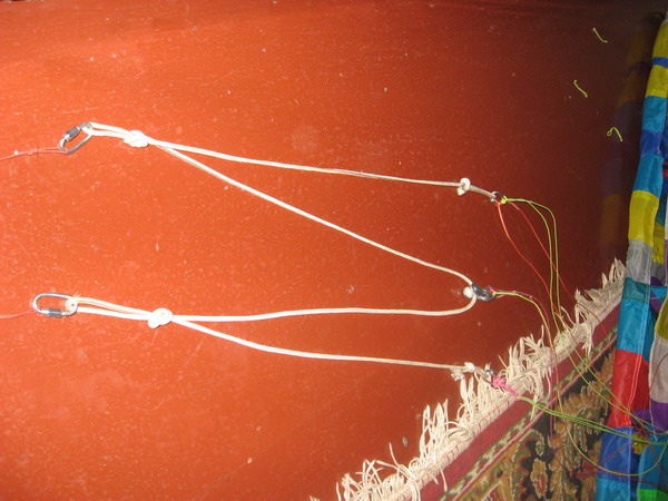 По поводу силовых строп от планки до кайта. Поначалу ставил дайнему, теже парапланерные стропы от нижнего яруса, 200-ки помоему, но т.к. они старые постоянно рвались. Я собрал их по несколько штук. Центральных по две стропы, от планки - по три. Общая длина составила 15 метров, это мало, но покататься удалось. Потом я снял стропы со старого ПО-9, сшил их цепочкой, общая длина - 23 метра. Перед усановкой стропы одним концом соединил к стене, другим к себе, своим весом попробовал их нагрузить, они как бы сначала вытягиваются сантиметра на 3 и останавливаются. Это связано с тем, что они плетеные, и просто убирается слабина на волокнах. Как стропы нагрузятся, растяжения дальше нет.