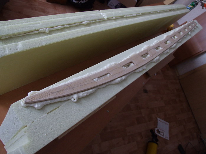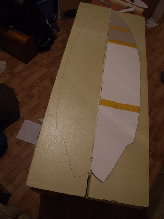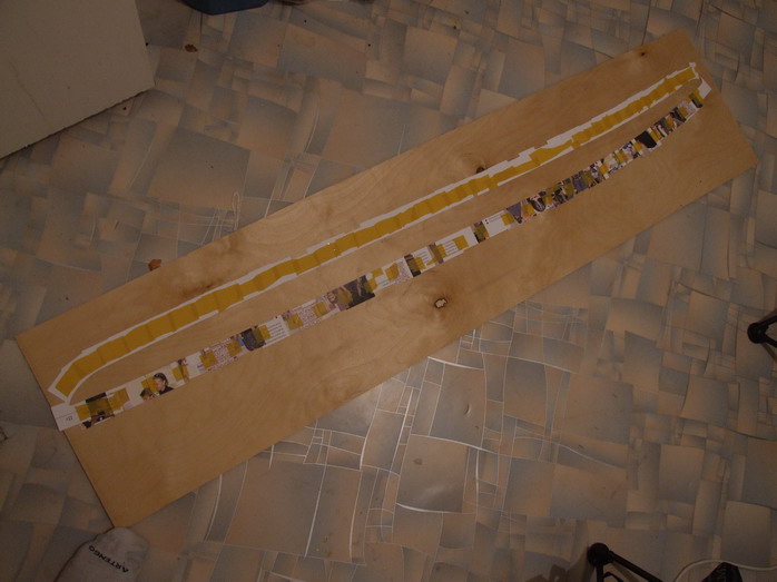 Я подумал, что стрингер будет легче, если сделать его профилированным тем более, что толщина 12 мм и склеен из двух 6 мм листов. К тому же лучше приклеется на пену к пенопластуи, а также пена будет еще содеинять листы пенопласта меж собой. Меня отговаривали, но время покажет, тем более что размер доски не очень большой.