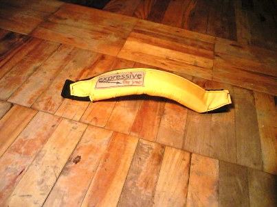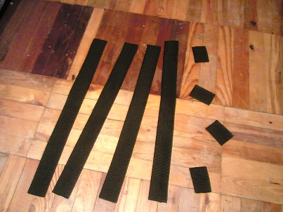 Теперь непомешает сделать накладку(или бандаж). Наверное лучше использовать неопрен,но за неимением оного я беру ткань и ламинантную подложку.Опять таки липучка и швеиная резинка(чтоб уши нетопырились,которые болты прикрывают(типа для красоты )).Еще можно какую-нибудь нашивочку приспособить..