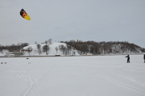 Пока Игорь отдыхал, решил я попробовать его плпночный Блейз, темболее они у нас одинаковых площадей. Ветер был от 3 м/сек до 5 м/сек. Тоесть достаточно для умеренного перемещения под кайтом. Первое что бросилось в глаза это четкая реакция кайта на положение планки на себя от себя. Моя моторика привыкла что кайт прет постоянно и регулировать тягу нечем просто для уменьшениятяги поднимаю кайт ближе к зениту.И при этом явно нехватает тяги, хотя мой Fct 7.0 минуту назад меня катал и проблем с тягой не было. Вобщем семерка блейз 2 с планкой меня еле катала и приходилось постоянно подмахивать кайтом и все равно остановки были, потому как явно нехватало силы ветра для перемещения моих 100 кг на лыжах по снегу. ( ну такой я кабан )