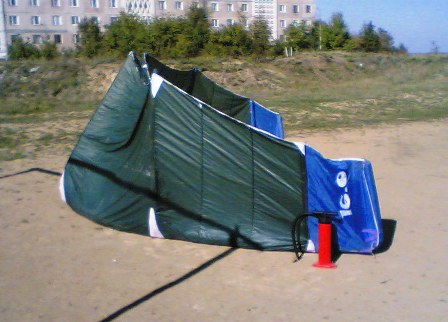 Кое-что подправил,жду подходящей погоды.А так вкратце первые впечатления довольно не плохие.Что касается летных качеств,то из-за большого размера,кайт довольно спокойный(не путать с тормознутостью).если в зените висит,то значит и прилично тянет.Довольно приятный момент,это когда кайт над головой,и если потянуть за планку,то он спокойно отрывает с земли и сливая по ветру плавно переносит на какое-то растояние...Обратный старт не пробовал,на земле жалко,но думаю,если прицепить пятую стропу,то все получится...Из неприятных моментов- это подготовка перед стартом,процесс надувания...Это не долго(насос большой) но всеравно ... Да и вааще ,на земле как-то аккуратно с ним нужно....
