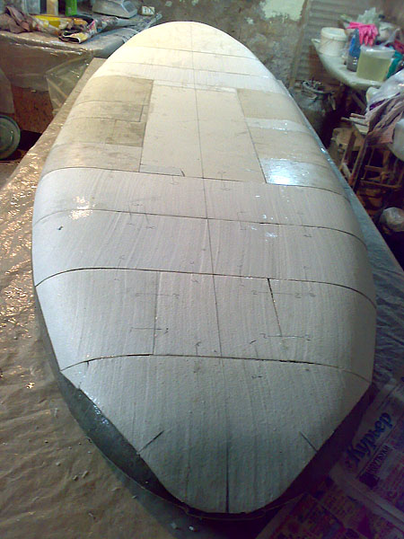 Повезло с пенопластом-нашел большими кусками.3 куска в стык,ну а дальше по известной технологии-струна,шкурка и вперед к светлому cерферному будущему...