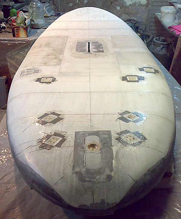 Легкой конструкционной стеклоткани прямого замасливания до 200 г/м не нашел...тяжелой полно но не подходит.Попалась непонятная пропарафиненная тряпка серебристого цвета 180грамм на метр,сетчатого плетения,стыренная еще в 90 годах на судостроительном заводе ЗАЛИВ.Парафин изничтожал в муфельной сушилке при 250-300 градусах,4-5часов.(надо бы дольше,дык гнали взашей).Кинул первый слой,завакуумировал.Сушил печкой под полиэтиленом.Лучше всего подходит тепловентилятор.Зашпатлевал,пошкурил,кинул второй слой.На этом этапе,где уже видна вся КОСМИЧЕСКАЯ МОЩЩЬ будущего МЕГАдевайса необходимо страшным усилием воли взять себя в руки,дабы не побежать на ближайший водоем для гидродинамических испытаний!!! Shocked С твердым пенопластом в стране тоже напряженка.нашёл несколько огрызков,струной распустил на пластины.Кроил по месту.Края палубы гнул феном.Дальше намазал смолой и в вакуум.