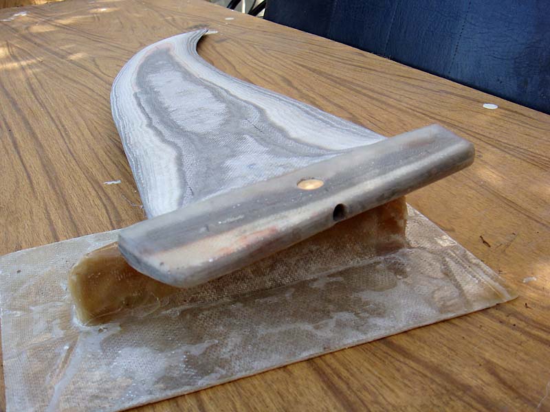 3.Самый сложный участок-оголовок (он должен плотно и точно впихиваться в POWER-BOX)Можно неделю точить вручную его хитрые углы и в конце одним движением все просрать...Поэтому пользуясь советом тов.Ленина-пошёл другим путём.Быстро,по имеющемуся плавнику выклеил BOX,туда вертикально вставил заготовку,зазоры заполнил смолой.Готовая деталь практически не требует доработки.