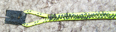 Для этого берем стропу или ленту дакрона (главный кретерий выбора материала- отсутствие растяжения) и пускаем ее по ТЕ. Прошиваем зигзагом подгибая припуск на шов на кайте. Концы этой ленты должны выходить петлями. К ним будут цепляться клеванты. Вот так сделано у меня.