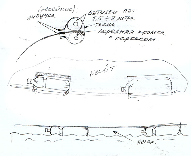 по поводу плавучести пришла мысль бутылки пластиковые поставить, может даже и с тканью не заморачиваться, а просто резинки пришить потуже. Кайт не прилипнет к воде намертво, в промежутки всё равно ветер задует.