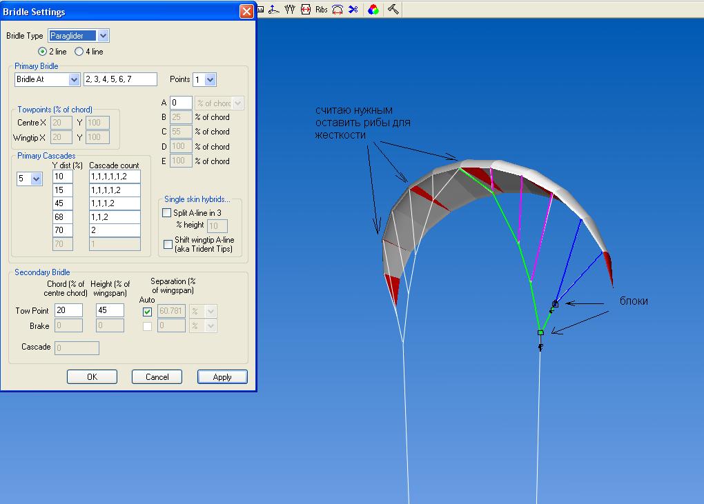 стропы-то все-таки нужно в одну точку свести, тяговитости на профиле добавил, углы аэродинамичкской крутки чуть меньше. Рибы конечно добавят жесткости на порядок, но при удлинении 5 можно и без них попробовать (опять же добавить никогда не поздно).
